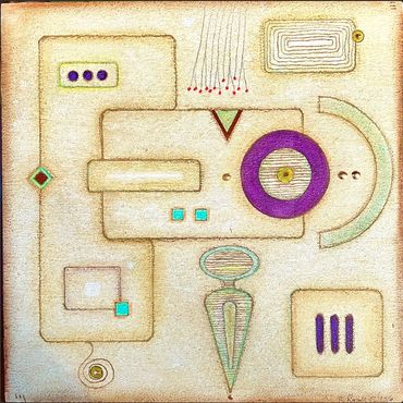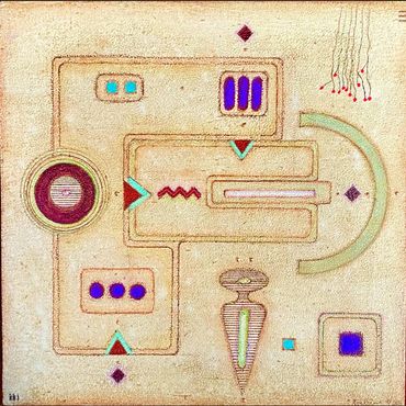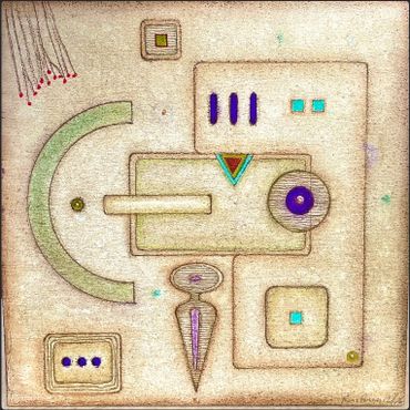 The "NachtMusik" series is inspired by the music of the early twentieth century serialist composers, particularly Arnold Schoenberg. The black squares each represent one of the twelve notes of the musical scale. Each is given equal weight, and there are no repetitions in any of the rows or columns in which they appear. These constitute the "melody" or tone row providing a foundation upon which the rest of the composition is based. In most instances, there are also counter themes comprised of squares of different color, or squares which are only partially filled. These represent the three variations possible in the context of Schoenberg's principles: inversion (upside down), retrograde (backward), or retrograde inversion (upside down and backward). The other symbols or elements provide a sort of harmonic structure, as well as dynamic gradations, such as crescendo/decrescendo, and are arranged in such a way as to maintain balance and rhythm against a more neutral background. These elements often occur in groups of triplets arranged in such a way as to suggest interwoven contrapuntal motifs, which also constitute a type of rhythm and serve to integrate all of the other components within each composition. Many of these elements unmistakably evoke the Southwest in terms of palette and symbolism, thereby reconciling ancient and contemporary aesthetics.